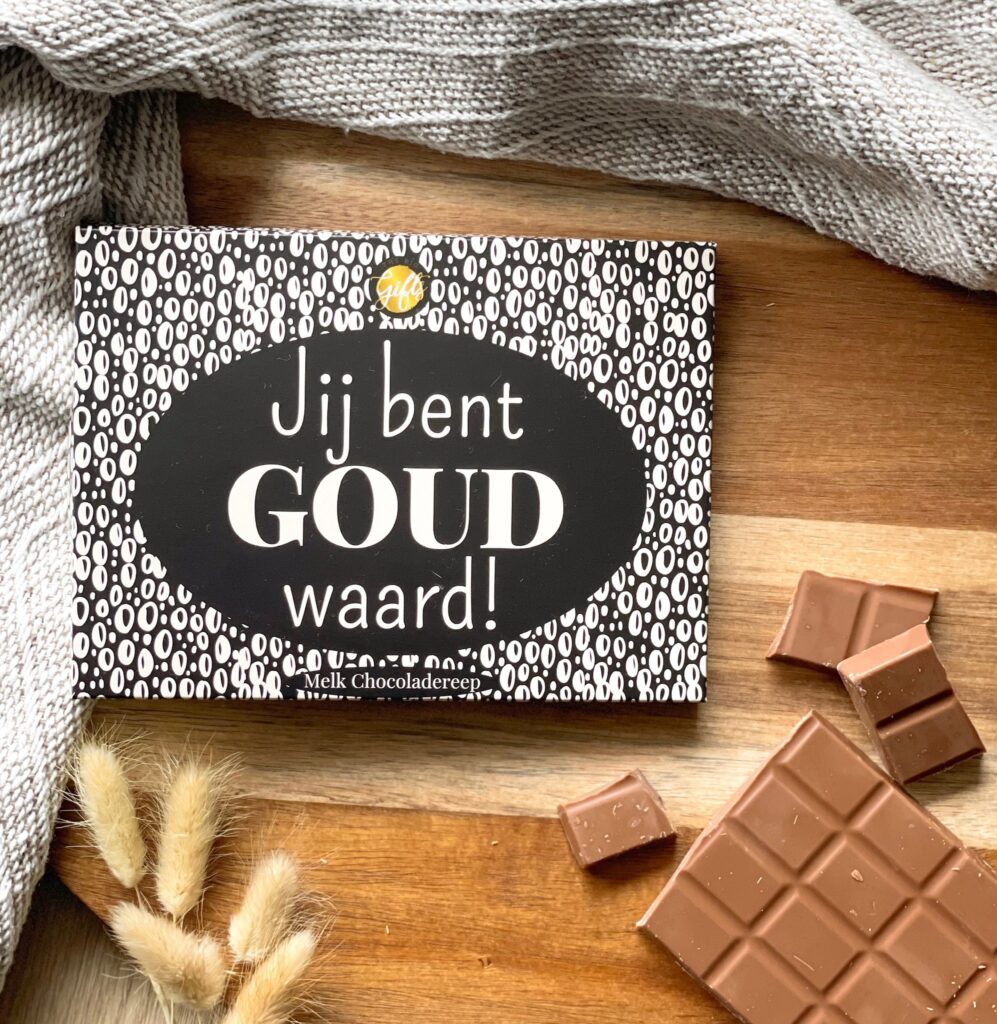 Of je nu jezelf wilt verwennen, iemand wilt verrassen of een bijzonder moment wilt vieren – deze chocoladereep is altijd een gouden keuze.Laat je verleiden door de heerlijke smaak, de mooie presentatie en de warme boodschap. Een uniek cadeau om te laten zien hoeveel iemand voor je betekent – want sommige mensen zijn écht goud waard.